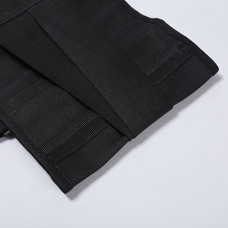 Third, pull on the elastic back straps and attach the strap to the waist belt.