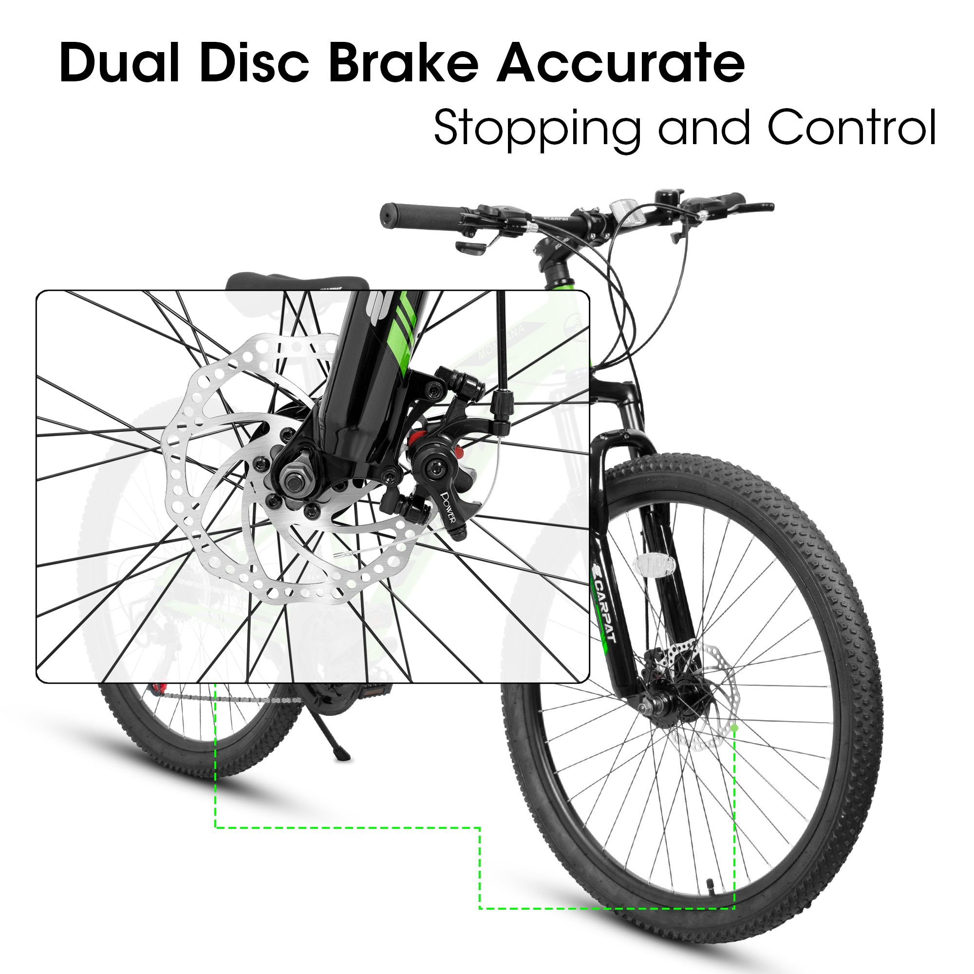 4.[26*2.125" Tire] 26*2.125" Rubber mountain pattern tires with high friction. Anti-skid and wear-resistant with strong grip and puncture resistance for hillsides, gravel, city streets and trails.